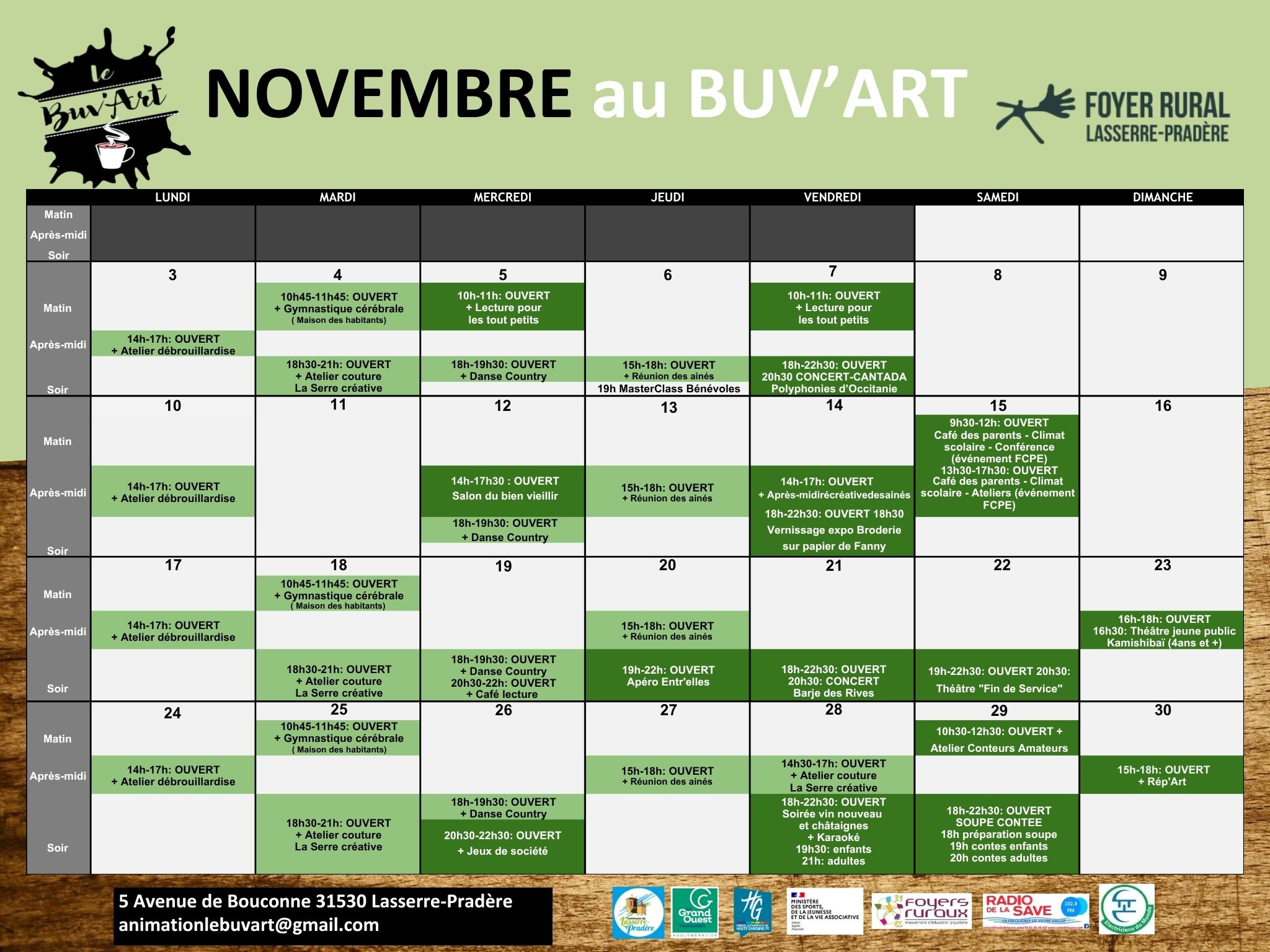 Calendrier mensuel avec tous les moments d'ouverture et activités régulières