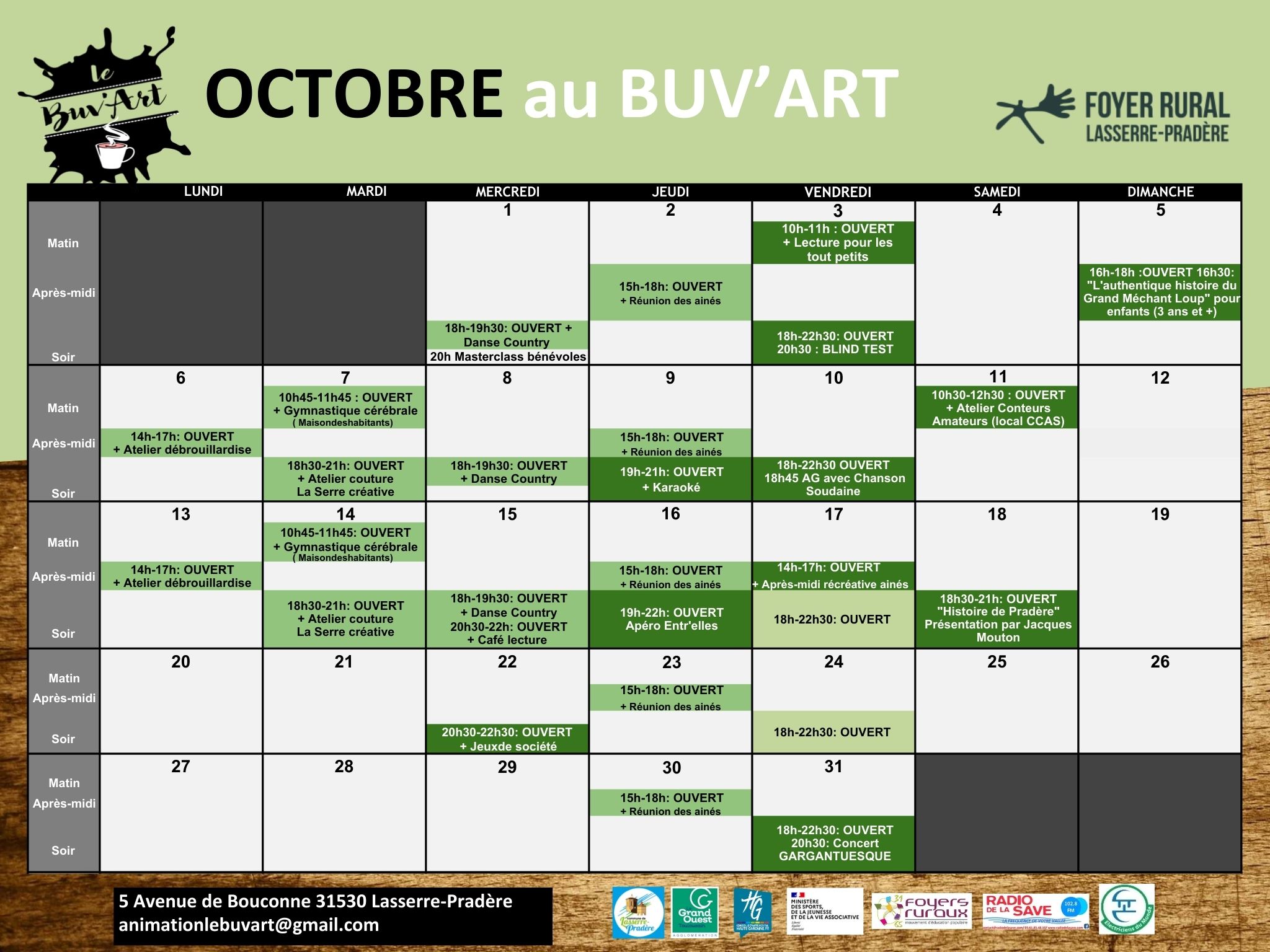 Calendrier mensuel avec tous les moments d'ouverture et activités régulières